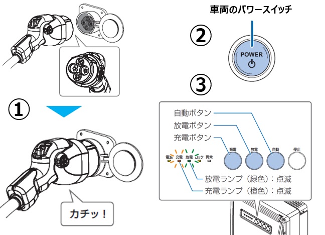 ① 充放電コネクタを車両に接続